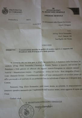 L'ex Assessore Romandini ritorna in Provincia con un incarico come esperto tecnico a supporto dell'attività del Presidente a titolo gratuito ed afferente alle seguenti materie: Emergenza da calamità naturali, Viabilità, Manutenzione stradale, Progettazione, Difesa del suolo.