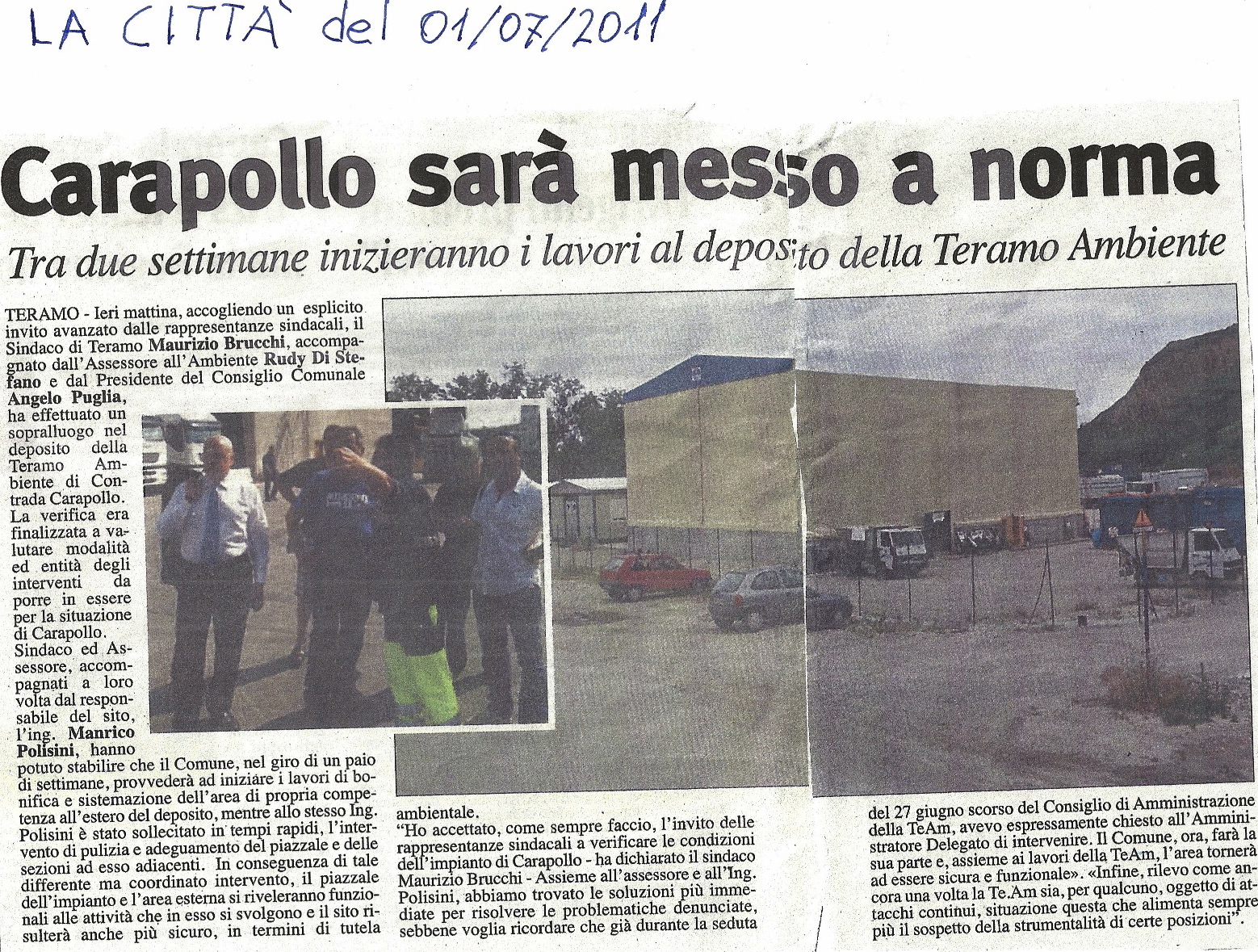 Eccoci come promesso. Vi cito l'Articolo del quotidiano La Città, un giornale che rappresenta e dipinge la provincia teramana, per non autocitarci e avere un testimone oculare. Era il primo Luglio del 2011, quando dopo molti servizi giornalistici, che denunciavano lo stato indecente del centro di Carapollo, una mission istituzionale, formata dal Sindaco Brucchi, l'assessore all'Ambiente Rudy Di Stefano e dal Presidente del Consiglio Comunale Angelo Puglia, ha rilasciato confortanti dichiarazioni sul futuro imminente della struttura di trasferimento rifiuti aprutina. La sintesi delle loro dichiarazioni?