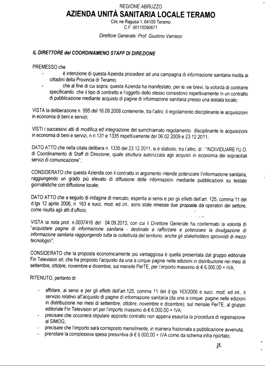Mittente il Direttore Generale dell'Asl di Teramo, Giustino Varrassi.