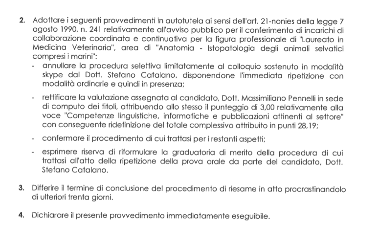 Si annulla la procedura di selezione del secondo in graduatoria per l'avviso pubblico per il conferimento di incarichi di collaborazione per laureato in medicina veterinaria.