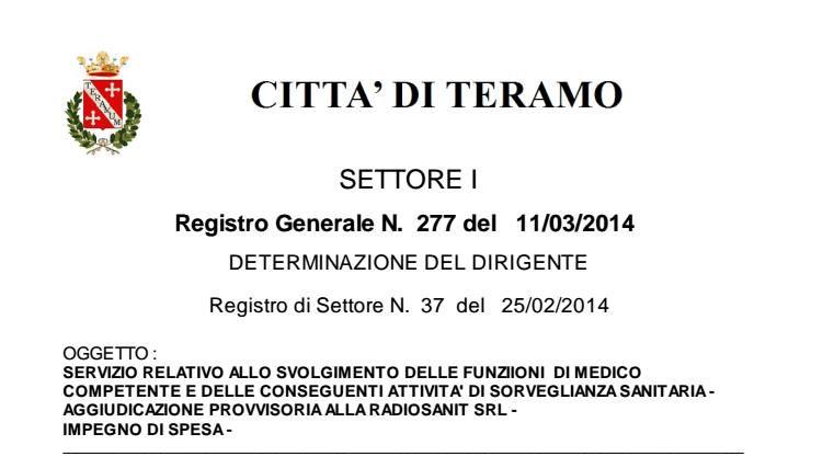 Nella Determina n 254 del 13/02/2013, si leggeva" Premesso che con determina dirigenziale n. 2352 del 20/12/2011 si è preso atto del verbale della Commissione di gara del 13/12/2011 aggiudicando alla RADIOSANIT srl il servizio relativo allo svolgimento delle funzioni di medico competente e delle conseguenti attività di sorveglianza sanitaria;