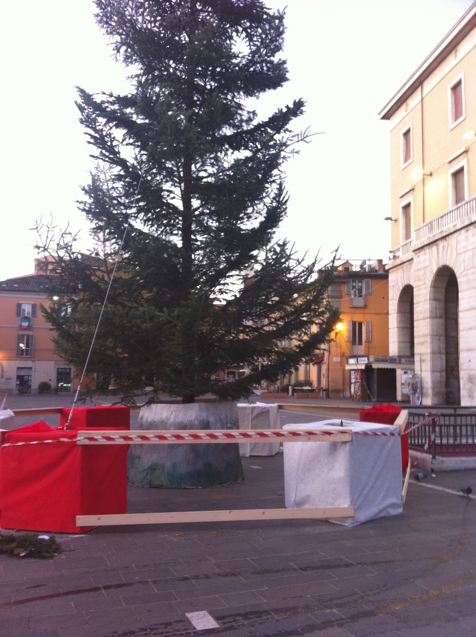 Sono discesi dal cosmo infinito con un regalo per la popolazione teramana. Un abete di Natale. Piazza Martiri. La splendida piazza aprutina. Scelta tra le prescelte. Quattro mega blocchi di cemento come base.