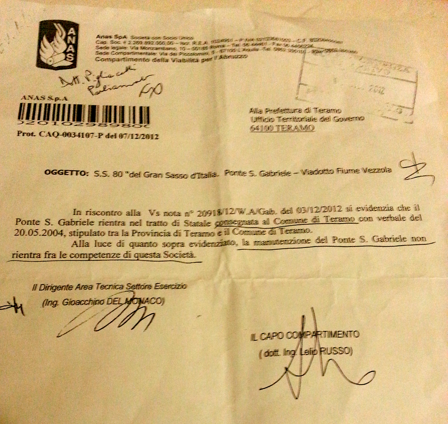 Si legge a firma del capo compartimento Anas Ing. Lelio Russo " ....si evidenzia che il Ponte San Gabriele rientra nel tratto di Statale consegnata al comune di teramo con verbale del 20.03.2004, stipulato tra la provicnai di teramo e il Comune di Teramo. Alla luce di quanto sopra evidenziato, la manutenzione del Ponte San Gabriele non rientra fra le competenze di questa società".