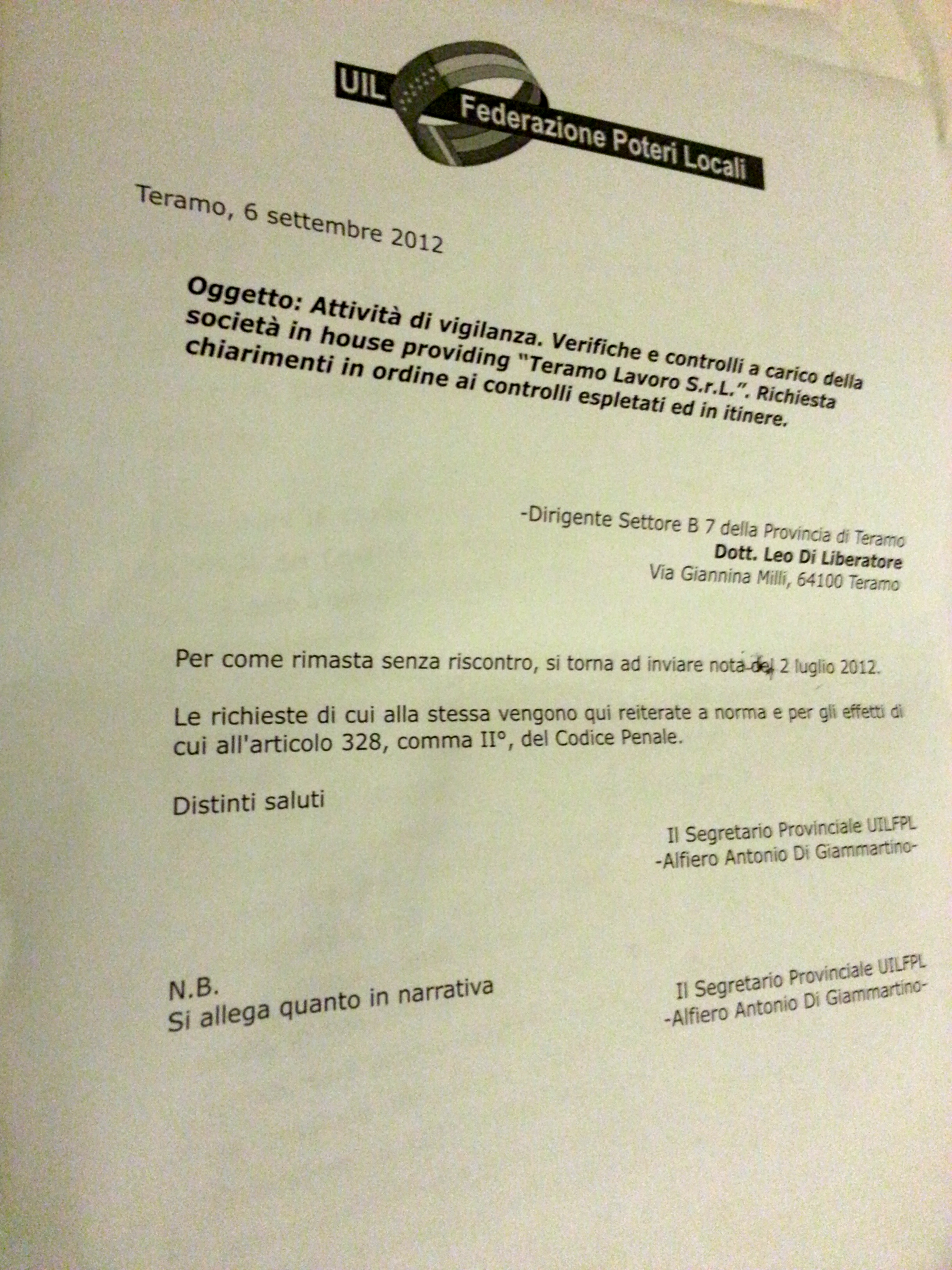 Perchè il Dirigente del Settore B 7 della Provincia di Teramo, dott. Leo Di Liberatore non ha risposto all'Oggetto della richiesta del sindacato UIl su Teramo Lavoro?